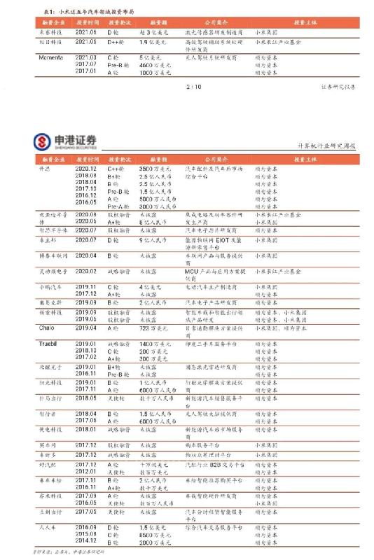申港证券在研报中提到,相比后期有意形成汽车领域“小米生态”的战略投资,小米前期智能汽车方向的投资以财务投资为主。