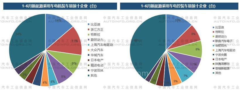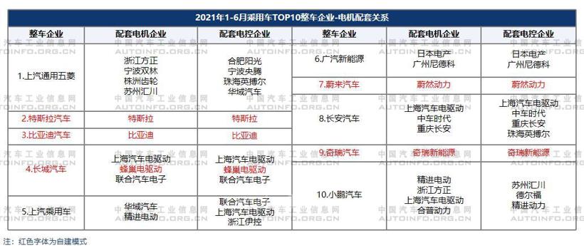 2021年上半年乘用车前十名的整车企业的电机配套商中,特斯拉、比亚迪、长城汽车、蔚来汽车和奇瑞汽车等整车企业都有自建的配套商。