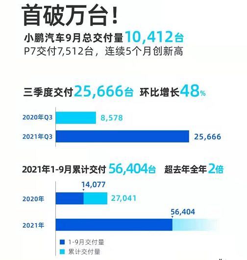 小鹏汽车9月总交付10,412台,为行业内首个单月交付破万的新型车企,环比大增44%,同比增长199%,连续15个月同比翻番。其中P7交付7,512台,这也是P7连续五个月创新高。