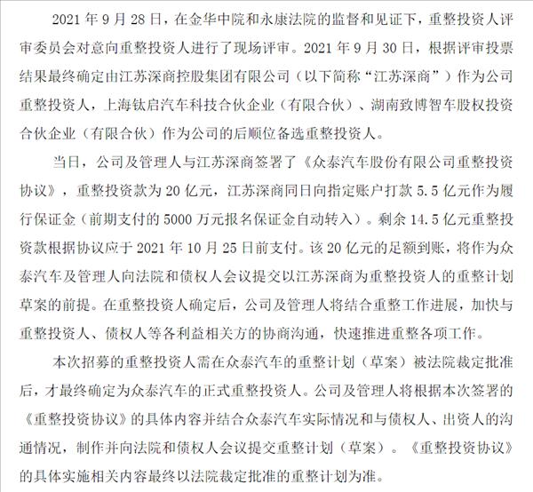 当日,公司及管理人与江苏深商签署了《众泰汽车股份有限公司重整投资协议》,重整投资款为20亿元,江苏深商同日向指定账户打款5.5亿元作为履行保证金(前期支付的5000万元报名保证金自动转入)。