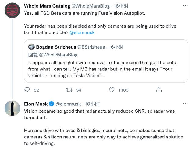 据了解,更新到FSD Beta 10.2的大约3000辆车型的雷达已被正式关闭,将仅采用视觉系统,特斯拉表示,视觉系统相比于雷达降低了信噪比,所以关闭了雷达系统。人类通过眼睛和生物神经网络驾驶,所以摄像头加硅神经网络是实现通用自动驾驶的唯一途径。