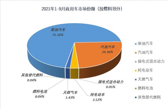 上图可见,2021年1-9月,商用车市场仍是以传统燃料为主导,柴油车在今年前9月的商用车市场占到了71.53%的份额,超过7成。新能源汽车(纯电动、插电式混合动力、燃料电池)仅占约2.6%,其他替代燃料汽车更是仅占几乎可以忽略不计的0.04%,仍是小众选择,新能源商用车中纯电动占比最高,达到2.52%;燃气车在2021年前9月的商用车市场里占到了1.43%的份额。