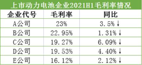 2021上半年头部5家上市公司动力电池业务毛利率均出现了不同程度的下滑,且整体毛利率处于23%及以下。