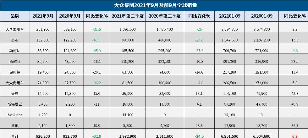 10月15日,大众集团发布了第三季度汽车销量数据。第三季度,大众集团在全球范围内共交付197.29万辆汽车,较去年同期减少了24.5%。大众集团在中国(包括香港)和欧洲销量的同比降幅严重影响了全球整体销量。但是,当季度,大众全球电动汽车销量为12.21万辆,同比上涨108.5%;其中,中国地区315.2%的销量涨幅为大众全球电动汽车销量做出了巨大的贡献。