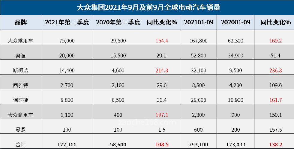 值得一提的是,尽管半导体短缺,大众集团的全球电动汽车销量在第三季度大涨,为12.21万辆,同比增长了108.5%,创下了新纪录。其中,中国市场加速增长,三季度交付了2.89万辆纯电动汽车,而上半年的交付量仅为1.83万辆。今年前9月,大众全球纯电动汽车交付量达到29.31万辆,同比增加了138.2%。大众插电式混合动力汽车的需求依然强劲,今年前9月,大众共交付了24.6万辆插电式混合动力汽车,同比增长133%,也是去年同期的两倍多。