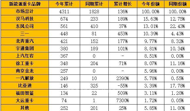 今年前9月,国内新能源重卡市场已有11位百辆及以上销量的“玩家”,排名前九的企业累计销量均超200辆,汉马科技、东风、三一、北奔重汽、宇通集团、上汽红岩、徐工重卡、南京金龙和一汽解放分别累计销售674辆、561辆、448辆、421辆、380辆、367辆、348辆、257辆和249辆,同比分别增长189%、37%、453%、177%、101%、净增、71%、净增、2390%(注:南京金龙开沃去年前9月有改装车销量,但底盘销量为零,均外购自徐工和庆铃等;今年以来南京金龙的新能源重卡均为自产底盘)。