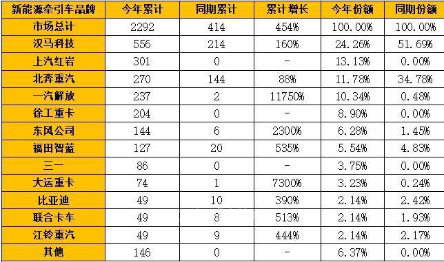 截止到9月,北奔重汽、一汽解放、徐工重卡、东风和福田智蓝分别有270辆、237辆、204辆、144辆和127辆新能源牵引车上牌运营,是除汉马科技和上汽红岩外另外五家销量破百的企业,在今年前9月新能源牵引车市场中的份额分别为11.78%、10.34%、8.9%、6.28%和5.54%,暂时排在行业第3-7位;排名第8及之后的企业今年1-9月新能源牵引车销量尚未超过百辆,但各家企业去年多未进入这一领域或者仅有个位数销量,因此各家企业均是暴增之势或是净增长。