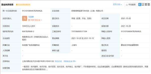 近日,据企查查APP显示,阿维塔新能源汽车科技(上海)有限公司成立,法定代表人为马欣捷,注册资本1000万元人民币,经营范围包含:汽车零部件研发;会议及展览服务;企业管理咨询等。