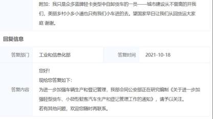 “蓝牌新规”对商用车行业以及卡友生计影响巨大,不少卡友到工信部网站部长信箱留言,问及轻卡新规大概何时落地?以及提出包括“提升蓝牌轻卡的车货总质量(让百万卡友留有一点生存空间)”的建议。对此,工信部在10月18日作出答复,表示为进一步加强车辆生产和登记管理,工信部会同公安部正在研究编制《关于进一步加强轻型货车、小微型载客汽车生产和登记管理工作的通知》。据此,“蓝牌新规”距正式颁布已经不远了。