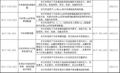 本次公告共有9项汽车行业标准公布,包括《微型货车防雨密封性试验方法》、《汽车紧固连接螺栓轴力测试 超声波压电陶瓷片法》、《汽车微电机用换向器》、《汽车用USB功率电源适配器》、《汽车用蜂鸣器》、《汽车材料中六价铬的检测方法》、《车用动力电池回收利用、单体拆解技术规范》等,根据公告,这批汽车行业相关的行业标准全部将从2022年2月1日起实施。