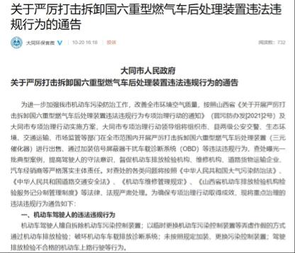 7月1日,重型车国六排放标准正式实施,随着贵金属价格不断上涨,部分司机、不法分子却盯上重型燃气车辆的后处理系统。9月底,太原市生态环境部对太原市展开空气质量改善监督帮扶,发现部分车主擅自拆除国六重型燃气车三元催化器进行出售,并通过加装信号干扰车载诊断系统(OBD),对环境空气质量造成不利影响。为有效减少移动源排放污染,提升省城环境空气质量,太原市自9月份开始开展严厉打击拆卸国六重型燃气车后处理装置违法违规行为专项整治行动。除省城太原外,山西大同、吕梁、临汾等地也相继安排部署严厉打击拆卸国六重型燃气车后处理装置违法违规行为专项治理行动。