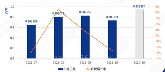 供给制约下,消费者不得不迎接漫长的交付期,部分品牌还需另行支付溢价,许多消费者观望情绪严重,这在客观上导致置换二手车源减少。数据显示,10月线上车源量降幅为2.6%,已连续两个月环比下降。