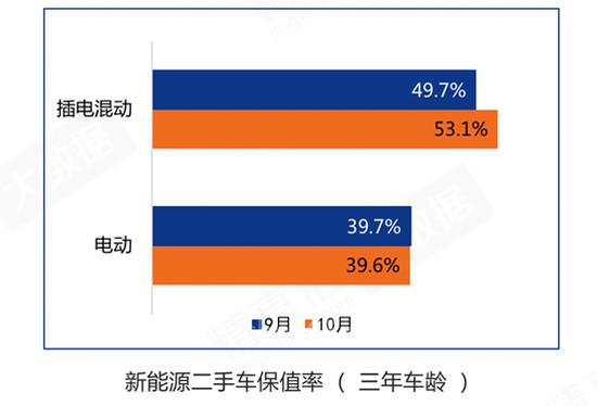 反观新能源汽车保值率则逊色不少。虽然Panamera插混、宝马5系插混、汉DM以及Taycan、Model X等许多车型保值率均在70%及以上的水平,但10月插电混动三年车龄平均保值率却只有53.1%,纯电动车型平均保值率更低,仅为39.6%。