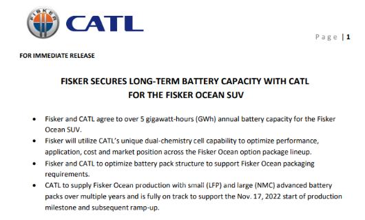 四、未来几年,宁德时代将为Fisker Ocean系列供应小型磷酸铁锂电池和大型三元锂电池组,以支持Fisker Ocean在2022年11月17日的量产。