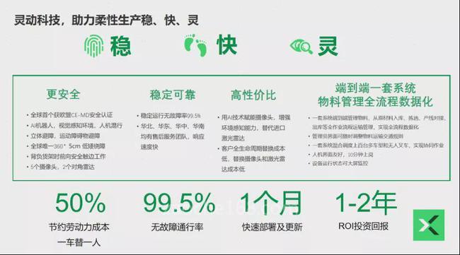 在移动机器人行业,AMR已经经历磁条技术、二维码技术、激光SLAM等多种导航方式的技术迭代,灵动科技在此基础上开发出第四代视觉自主导航AMR,在柔性化生产替代传统、规模化生产方式大势下,灵动科技可以实现大规模集群调度、50%以上环境变化、复杂动态场景下的稳定定位,以及动态障碍物识别,在整车厂不同车间实现良好适配。