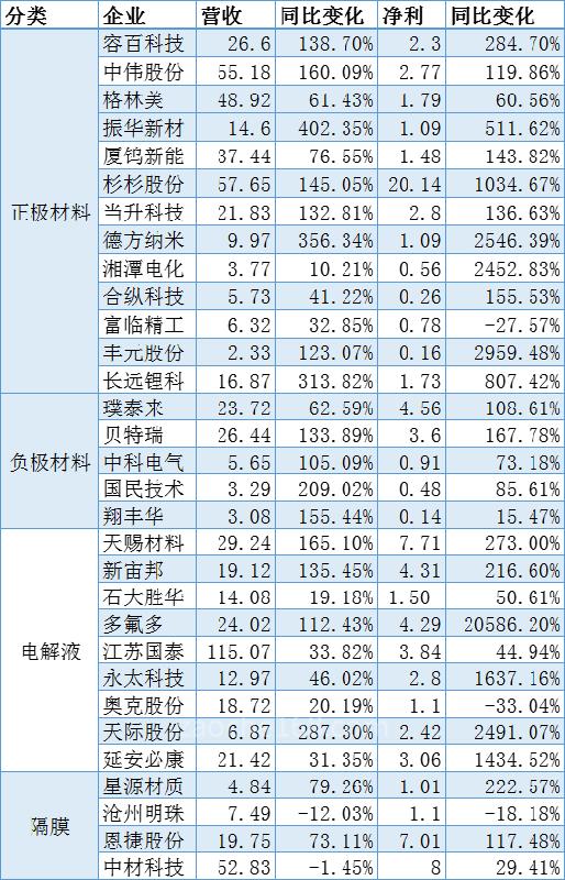 电解液(含六氟磷酸锂、溶剂相关企业)领域,六氟磷酸锂作为价格走势强劲的材料之一,多氟多、天际股份、永太科技、延安必康4家企业获益净利润爆发式增长,涨幅均在14倍以上,其中多氟多净利润增速高达205.8倍。