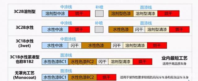 3C1B、B1B2等工艺缩短了涂装线长度,降低工艺成本和能源消耗,并且可减少涂料VOC和废气的排放,达到节能环保的目的,涂装常用的5种工艺路线如下: