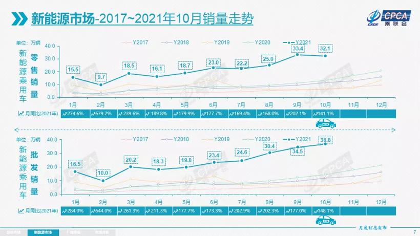 对于大家比较关注的新能源乘用车市场,上个月的零售销量达到了32.1万辆,同比增长141.1%,环比下降3.9%,渗透率为18.8%。其中,自主品牌的新能源车渗透率达到了36%,豪华品牌为12%,而主流合资品牌仅有3.4%。