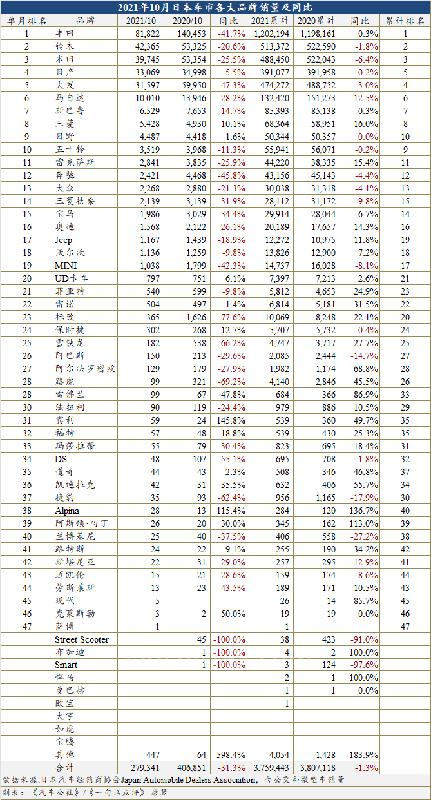 尽管,9月30日日本政府全面解除疫情紧急状态,10月疫情也确实在迅速好转,但因芯片短缺和供应链中断对日本汽车行业造成了沉重的打击,经济也由于疫情遭受了巨大的损失,因此10月该国汽车市场销量继续大幅下滑。