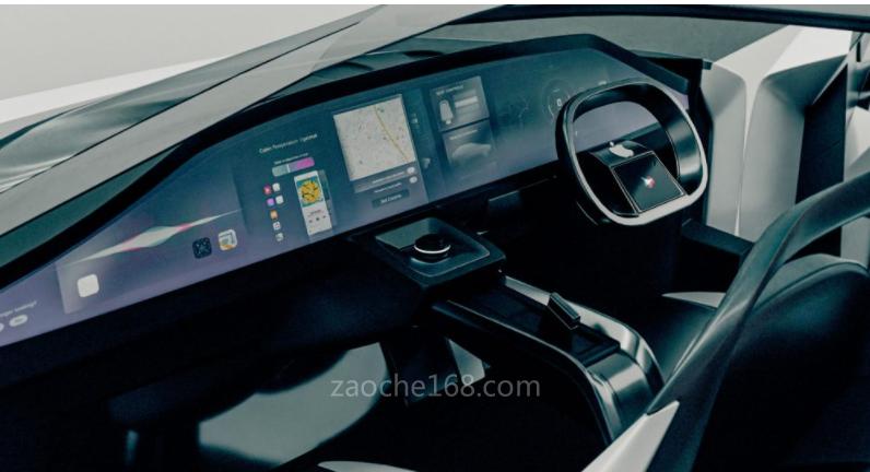 仔细观察之下,会看到一些智能温度控制、一个类似CarPlay的应用启动器、Siri波纹动画、现在可以播放的控件等等,甚至在方向盘的中间集成了一个显示器。