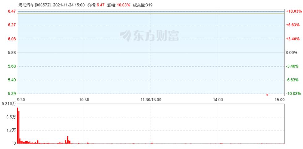 该公告发布后,11月24日,海马汽车开盘后一字涨停,当日股价报收6.47元,涨幅超过10%,最新市值106.41亿元。