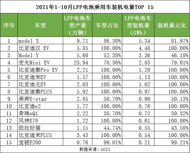 LFP电池装机的快速崛起主要受Model 3、Model Y、比亚迪汉EV、宏光MINI EV等现象级车型带动。前10月这4款车型贡献了超45万辆LFP电池车型,装机量高达16.1GWh,占乘用车LFP总装机量的比例双双超5成。