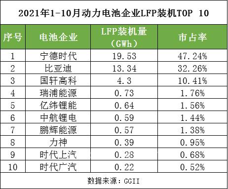 TOP 10企业装机占比高达98.2%,宁德时代、比亚迪、国轩位居TOP 3,也是仅有的LFP装机电量超10GWh的3家电池企业,累计占据9成市场份额。