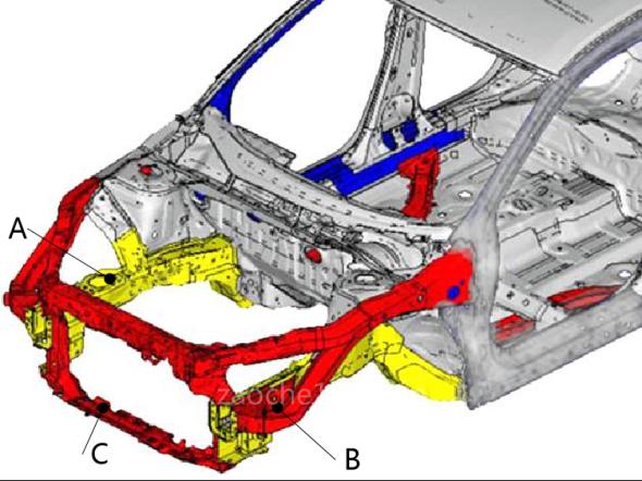 碰撞相容性指的是两车发生碰撞时,提升自我保护性能的同时降低对方的伤害。这就对汽车前防撞梁、前纵梁和副驾部分的结构设计和材料选取提出更高的要求,一般在车辆发生正向或偏置碰撞的时候,纵梁、底梁和A柱等结构是碰撞力的主要传递路径以本田思域为例,如图3所示。前纵梁采用多边形结构,使得有效碰撞压溃吸能;B位置的设计可以在偏置碰撞时避免错位,从而起到抵抗和大面积接触作用;C位置采用封