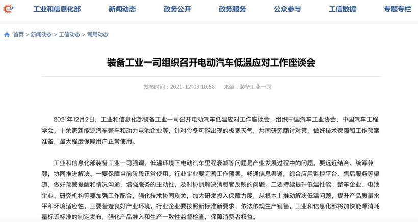 近日,工信部装备工业一司,召开电动汽车低温应对工作座谈会,组织中国汽车工业协会、中国汽车工程学会、十余家新能源汽车整车和动力电池企业等,针对今冬可能出现的极寒天气,共同研究商讨对策,做好技术保障和工作预案准备,最大程度保障用户的正常使用。装备工业一司强调,低温环境下电动汽车里程衰减等问题是产业发展过程中的问题,要远近结合、统筹兼顾,协同推进解决: