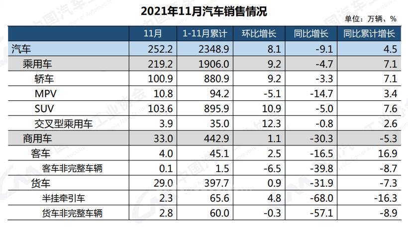 2021年11月,我国汽车市场单月销量达到252.2万辆,环比增长8.1%,同比下降9.1%,降幅比10月收窄0.3个百分点。自9月以来,我国单月销量环比持续增长,市场整体呈现回暖迹象。