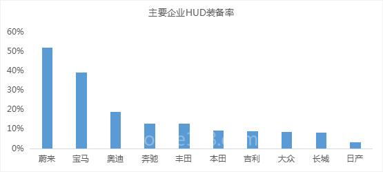 当前主流合资、自主品牌均已装备HUD,其中蔚来装备率处于高水平,达到52%;BBA紧随其后,但是装备率水平与蔚来汽车相距较大,三家豪华品牌中,宝马装备率最高,接近40%;丰田和本田位列豪华品牌之后,装备率水平接近或超出10%;自主品牌中,吉利、长城水平接近。