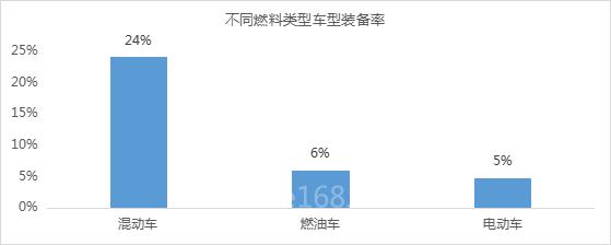 HUD车型的整体装备率为6.3%,从不同燃料类型来看,混动车装备率最高,达到24%,这与混动车型目前市场在售款型较少,且以日系品牌为主关系较大。日系品牌HUD应用积极,促使混动车型整体装备率水平较高。