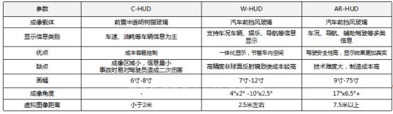 当前HUD主要产品类型分为C-HUD、W-HUD、AR-HUD,C-HUD已逐步退出市场,W-HUD是市场主流,AR-HUD基于AR技术,在画面呈现真实度、视场角、成像距离等形成新的优势,正在逐步导入市场。