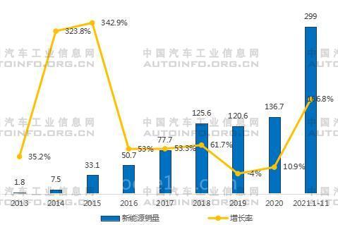 2021年,国内新能源汽车月销量整体保持高速增长趋势,产销继续创新高。1-11月累积销量渗透率提升至12.7%,消费者对新能源汽车接受度越来越高,新能源汽车市场由政策驱动转向市场拉动。