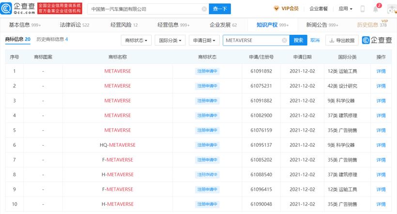 据企查查数据显示,近日,中国第一汽车集团有限公司申请注册多个“元宇宙”、“METAVERSE”、“HQ METAVERSE”、“F METAVERSE”商标,国际分类涉及运输工具、广告销售等,当前商标状态均为“注册申请中”。