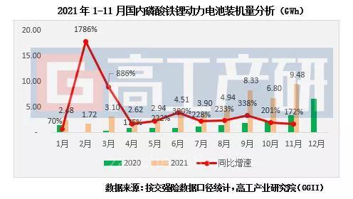 1-11月国内新能源汽车配套磷酸铁锂电池约116.6万辆,同比增长468%;动力电池装机量约50.82GWh,同比增长240%。