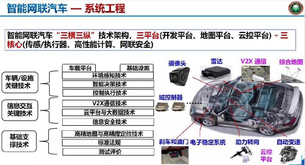 从系统工程的角度来看,智能网联新能源汽车可分为“三横三纵”技术架构——三平台,即开发平台、地图平台、云控平台,加三核心,即传感/执行、高性能计算、网联安全等技术。