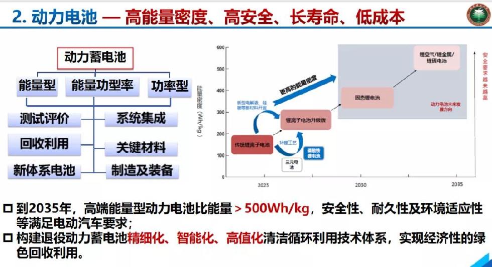 第二,高比能量密度、高安全、长寿命、低成本的动力电池。动力电池是未来智能网联新能源汽车领域激烈竞争的焦点之一,我们期待,到2035年,高端能量型动力电池比能量>500Wh/kg,安全性、耐久性及环境适应性等满足电动汽车全气候应用;并构建完善退役动力蓄电池精细化、智能化、高值化清洁循环利用技术体系,实现经济性的绿色回收利用。