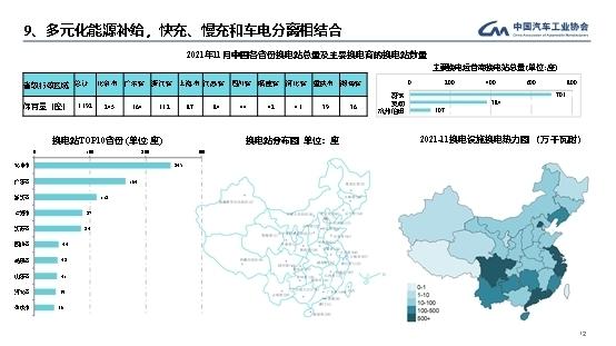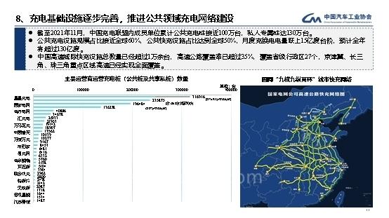 截至2021年11月,中国充电联盟内成员单位累计公共充电桩接近100万台,私人专属桩达130万台。中国公共充电设施规模占比接近全球60%,公共快充设施占比达到全球50%,月度充换电电量跃上15亿度台阶,预计全年将超过130亿度。中国高速城际快充设施总数量已经超过1万余台,高速公路覆盖率已超过35%,覆盖省级行政区27个,京津冀、长三角、珠三角重点区域高速已经实现全面覆盖。