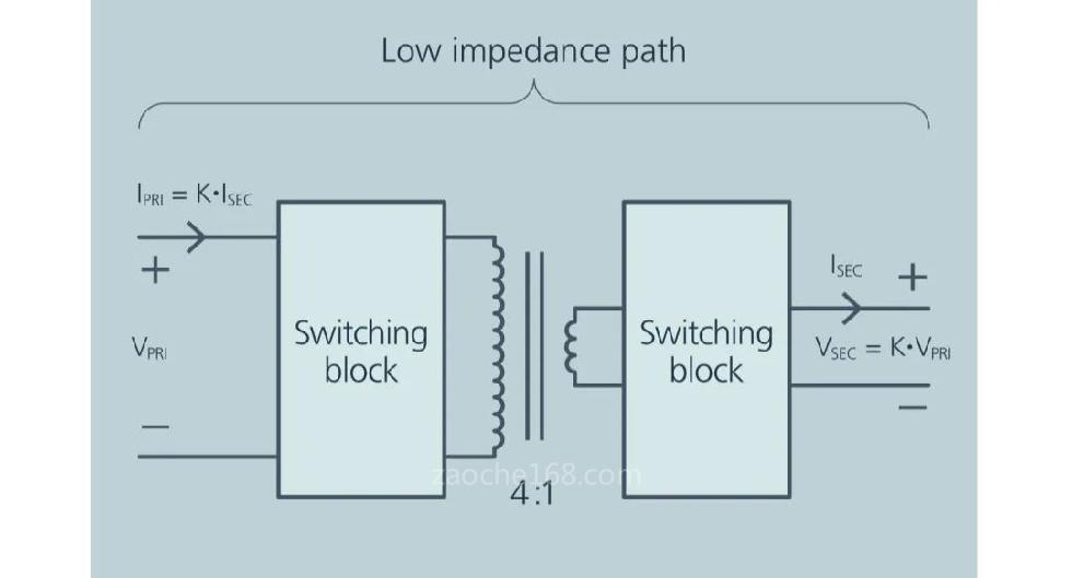 Vicor BCM® 母线转换器采用零电压、零电流开关(ZVS/ZCS)技术,其工作频率比常规转换器高,因此其响应速度比物理电池快。例如,BCM6135 与常规 ZVS/ZCS 谐振转换器不同,工作频率为 1.2MHz,该 BCM 在窄带频率下工作(图 3)。BCM 的高频率工作可针对负载电流的变化以及从输入到输出的低阻抗路径提供快速响应。固定比率转换、双向工作、快速瞬态响应(每秒超过 8MA)和低阻抗路径相结合,可帮助 BCM 使高压电池看起来像 48V 电池,我们将其称为“变压”。与常规转换器相比,这种对电源进行变压的功能既是重要优势,也是重要的差异化特性。