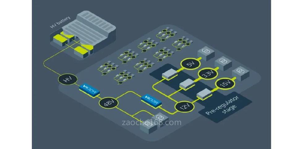 图 2:优化的 E/E 架构可取消 12V 的物理电池。使用 Vicor BCM 母线转换器技术转化高压电池,可创建虚拟 12V 电池。