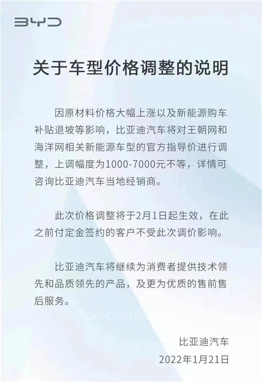 而继特斯拉、小鹏宣布全系涨价后,近日从比亚迪官方获悉,同样受限于上述几方面原因影响,将对王朝网和海洋网相关新能源车型的官方指导价进行调整,上调幅度为1000-7000元不等,详情可咨询比亚迪汽车当地经销商。此次价格调整将于2月1日起生效,在此之前付定金签约的客户不受此次调价影响。