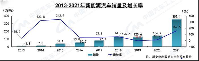2021年,在全球疫情的影响下,我国新能源汽车产销量依然呈爆发式增长。中汽协数据显示,2021年,我国新能源汽车销量352.1万辆,同比增长1.6倍,连续7年位居全球第一,市场占有率达到13.4%,高于上年8个百分点。