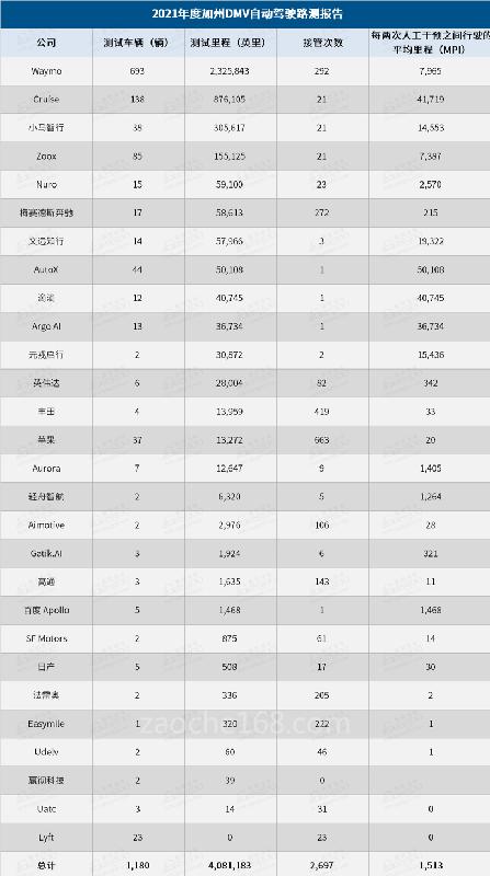 根据最新报告,上一年度(2020年12月1日至2021年11月30日),在加州进行路测的28家公司的1180辆自动驾驶车辆共计行驶了逾410万英里,几乎是2020年的两倍。在这1180辆自动驾驶车中,Waymo运营的车辆最多,有693辆,其次是Cruise,有138辆;另外就测试里程来看,Waymo和Cruise也位列前两名,其中Waymo占所有车辆总测试里程的半壁江山,中国自动驾驶初创公司小马智行排名第三。