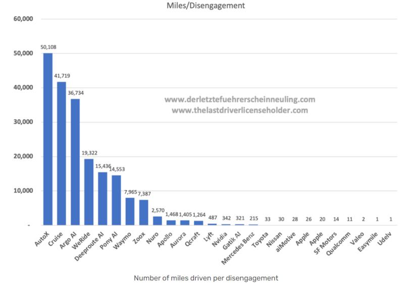 而通用旗下的Cruise从一开始就在旧金山开发自动驾驶汽车,其自动驾驶车队每41,719英里(66,751 公里)需要接管一次车辆,比2020年的水平(45,632 公里)下降了近50%。总部位于中国的初创公司AutoX的车辆每两次人工干预之间行驶50,108英里,位居榜首。然而,该公司的累计测试里程只有Waymo的46分之一。也是类似,该公司去年累计路测了36,734英里,期间人工安全员也只干预了一次。