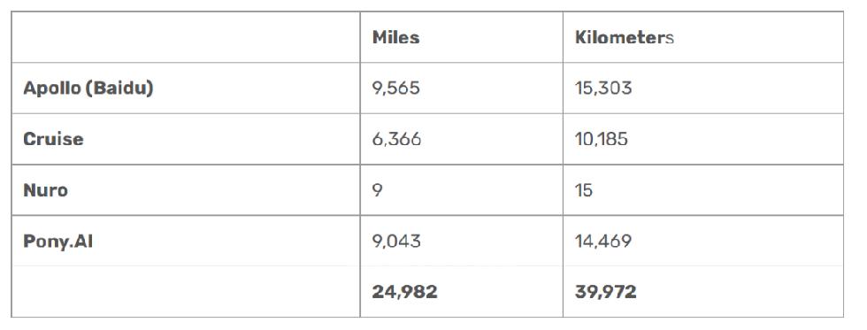 在7家取得无人驾驶路测(无需安全员)牌照的公司中,有4家(百度Apollo、Cruise、Nuro和小马智行)报告了无人驾驶路测的数据,去年,这4家公司的无人驾驶车总共行驶了24,982英里,不过去年底小马智行因为一次路测事故已经主动撤销了无人驾驶牌照。