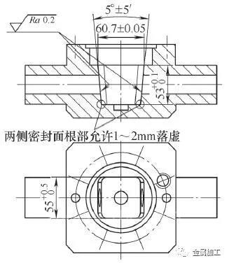 通过对阀体密封面处结构(见图1)分析,发现其存在如下特征:①密封面表面粗糙度值要求Ra=0.2μm,需进行研磨方能达到技术要求。②密封面位置处于阀腔中下部,且呈2.5°斜度对称分布于阀腔两侧,密封面底部允许1~2mm落虚。③阀腔密封面部位空间尺寸较小(60.7mm×55mm×53mm)。