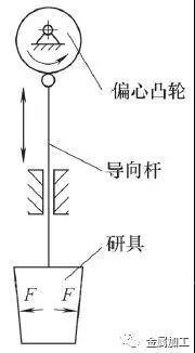 结合零件结构特征和研磨工艺要求设计工装工作原理,如图2所示,研具在一定作用力F下与密封面贴合,同时在偏心凸轮转动下,通过导向杆带动在一定范围内的上、下往复运动,从而实现对密封面微切削,达到研磨效果[1]。