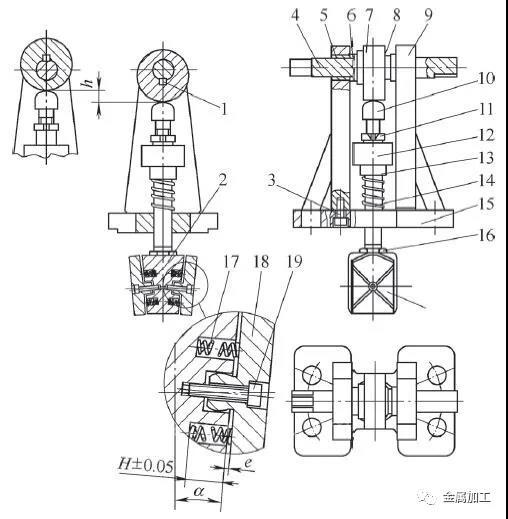 为保证间隙e均匀一致,对式中H深度公差控制在±0.05mm内,支撑弹簧精度满足GB/T 23934-2015《热卷圆柱螺旋压缩弹簧技术条件》中2级要求[4]。
