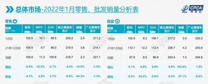 2月14日,全国乘用车市场信息联席会(以下简称“乘联会”)发布的最新销量数据显示,2022年1月,乘用车市场零售销量为209.2万辆,同比下降4.4%。